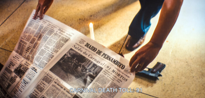 As the film unfolds, we see how communities in Recife consume information through local papers already contaminated by the regime’s agenda. In Dona Sebastiana’s house ‘Edifices Ofir’, the group of refugees in hiding reads the daily news with suspicion and dark humor, not trust. The headlines sit alongside the film’s flashes of magical realism, such as the severed leg that appears to lunge at passersby in the public square, and everyone in the room understands what it signals: the news is planted as a distraction.