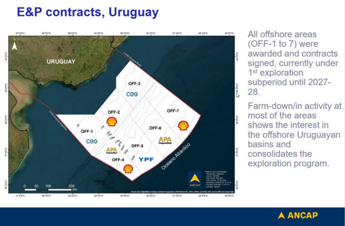 The ships have been contracted from Viridien, an ‘advanced technology, digital and Earth data company’ by Chevron and Challenger Oil Group (CEG). CEG in its turn is an oilfield development company based in the Isle of Man, which has now sold to oil giant Chevron part of its interest in Block OFF1, 180 km off the coast, one of 7 ocean blocks within the Uruguayan Exclusive Economic Zone contracted to different oil companies. Other majors involved include Shell, YPF (Argentina), and APA (Apache).